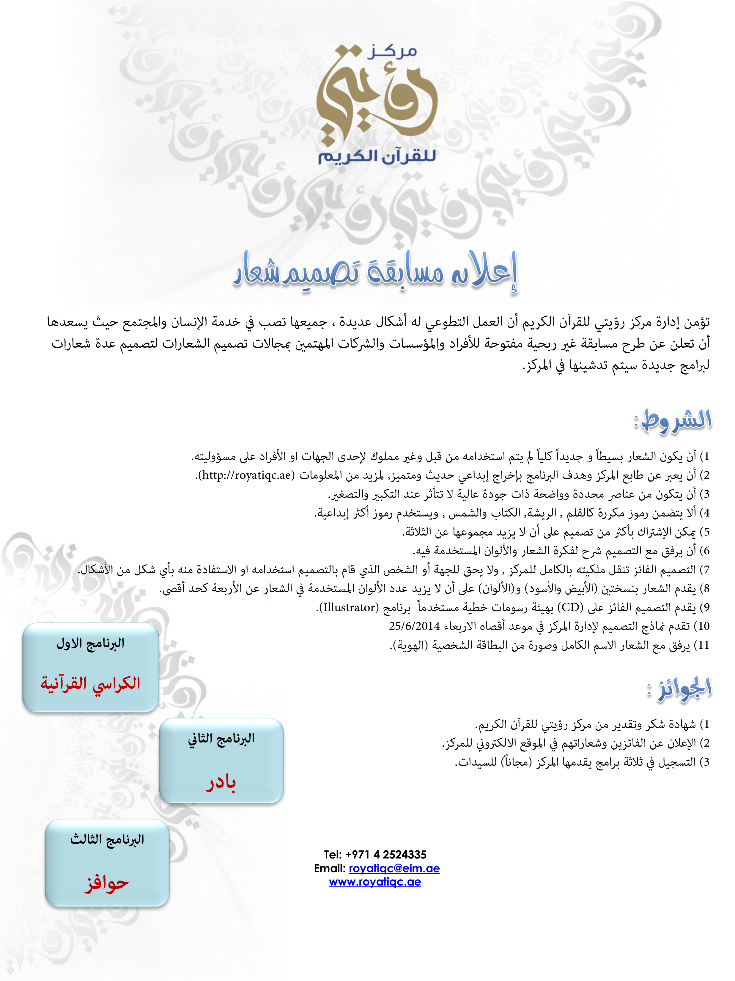 2) أن يعبر عن طابع المركز وهدف البرنامج بإخراج إبداعي حديث ومتميز, لمزيد من المعلومات (http://royatiqc.ae).