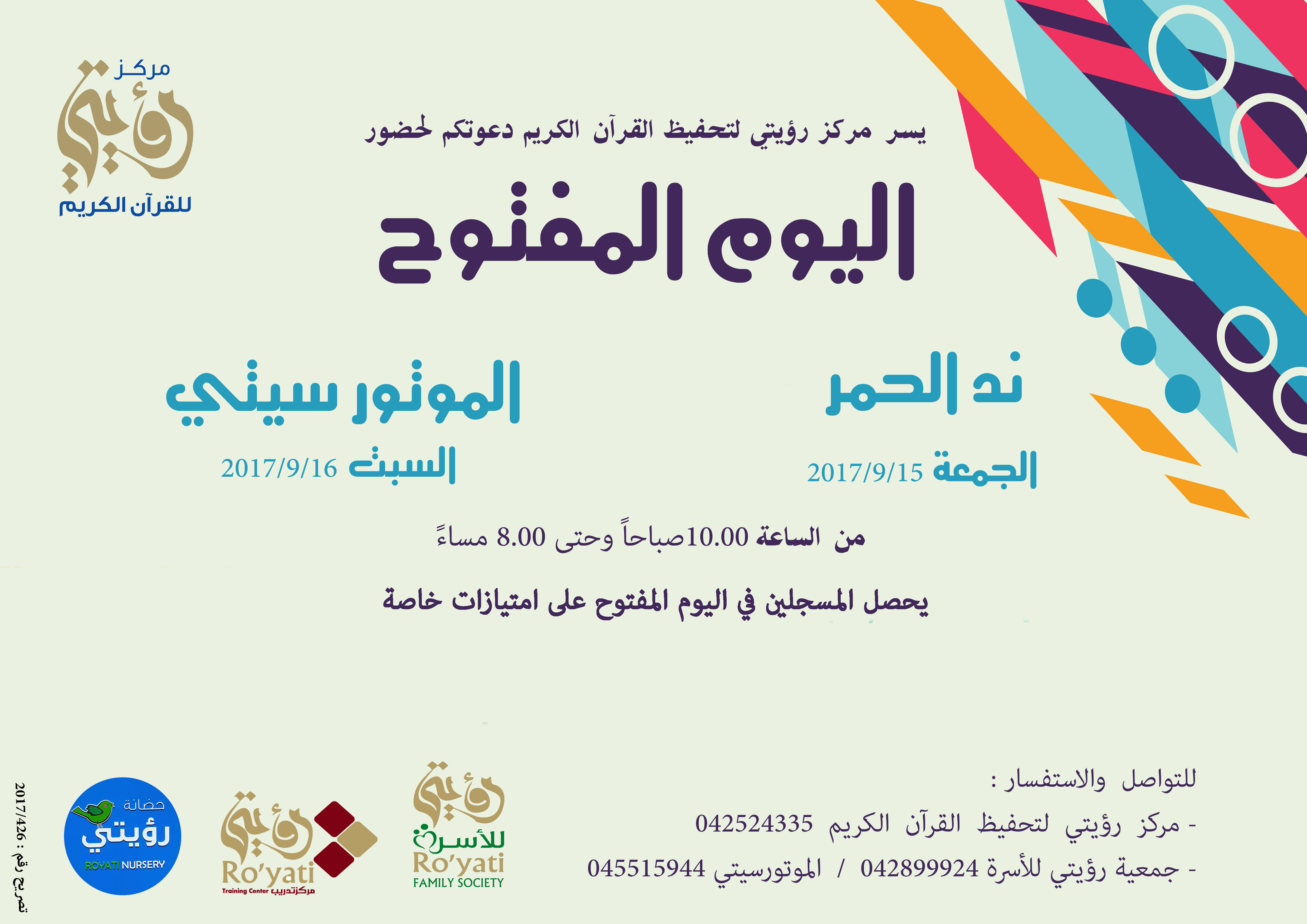 يسرنا أن نعلن عن فعالية اليوم المفتوح للتعريف بأنشطة وفعالية مركز رؤيتي لتحفيظ القرآن الكريم التي ستقام خلال عام 2017-2018 وذلك يوم الجمعة الموافق 15/9/2017 بمقر المركز ند الحمر ، ويوم السبت الموافق 16/9/2017 بجمعية رؤيتي للأسرة الموتورسيتي .